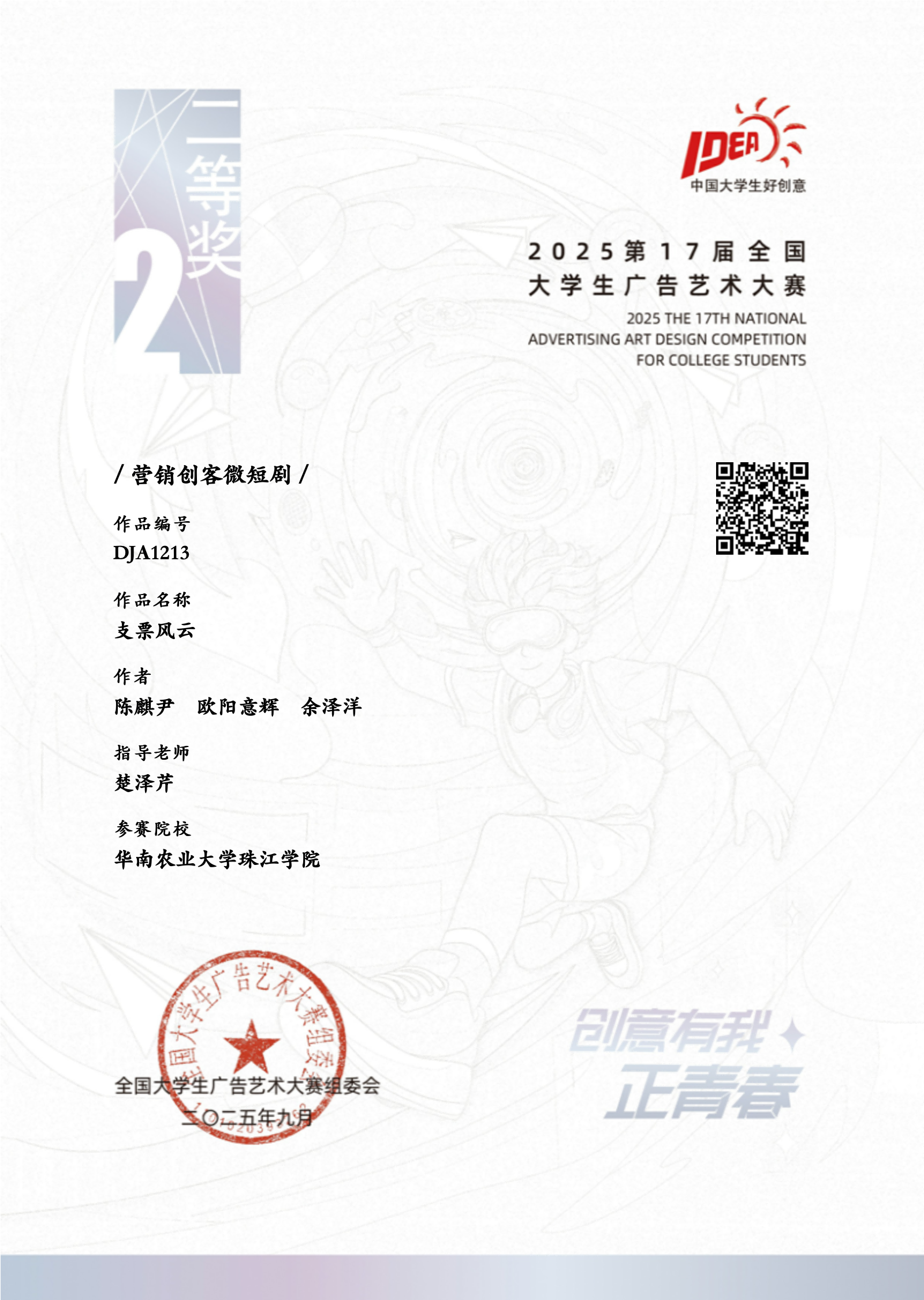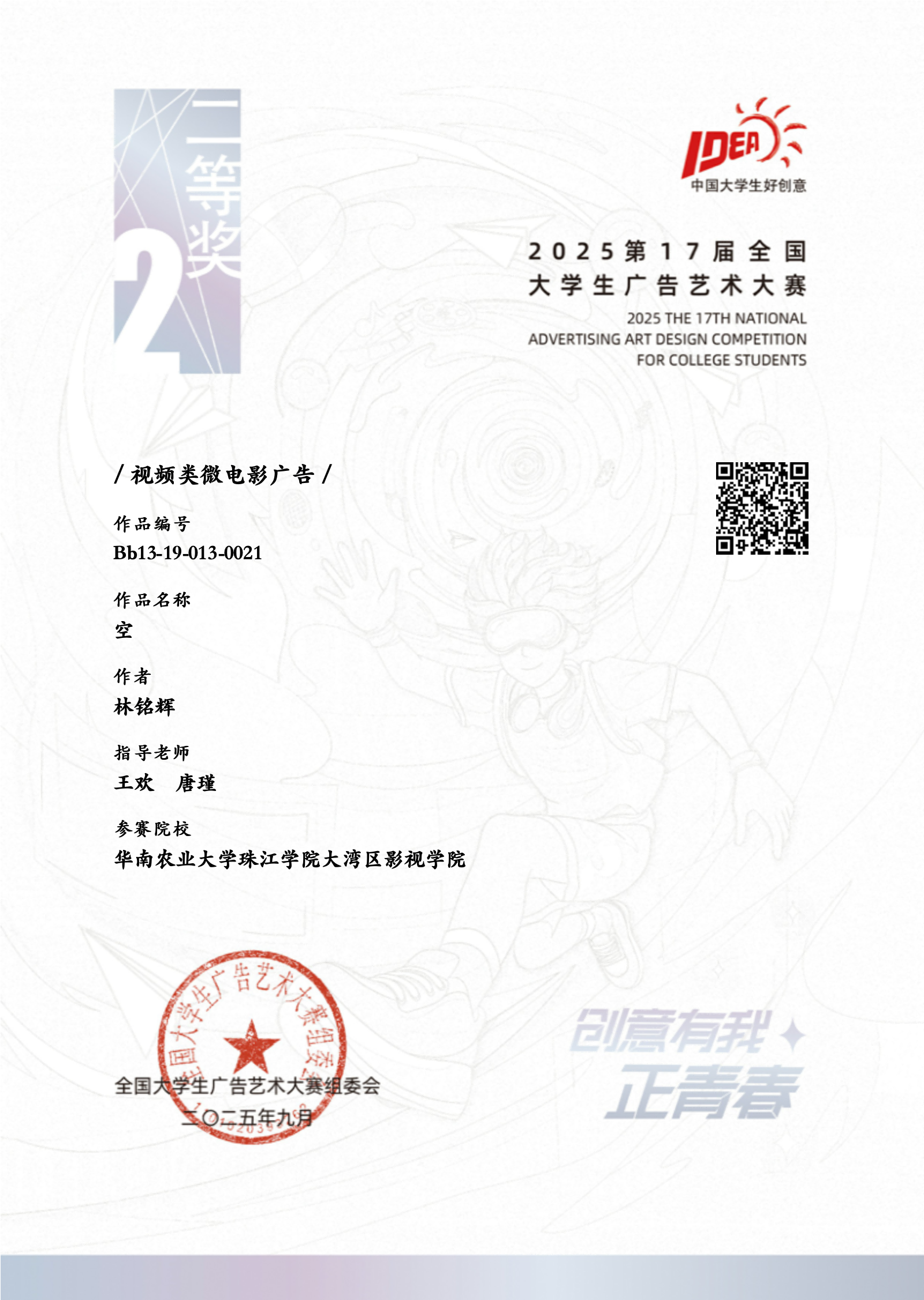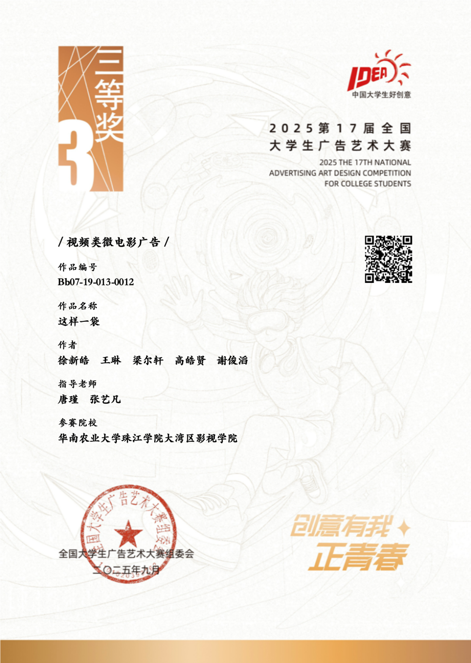 近日,第17届全国大学生广告艺术大赛(简称“大广赛”)全国总决赛获奖名单陆续揭晓。华南农业大学珠江学院大湾区影视学院学子在本次竞赛中表现优异,捷报频传。其中参赛作品《空》《支票风云》从全国众多参赛作品中脱颖而出,荣获全国二等奖,《这样一袋》荣获全国三等奖,另有七部作品荣获全国优秀奖。